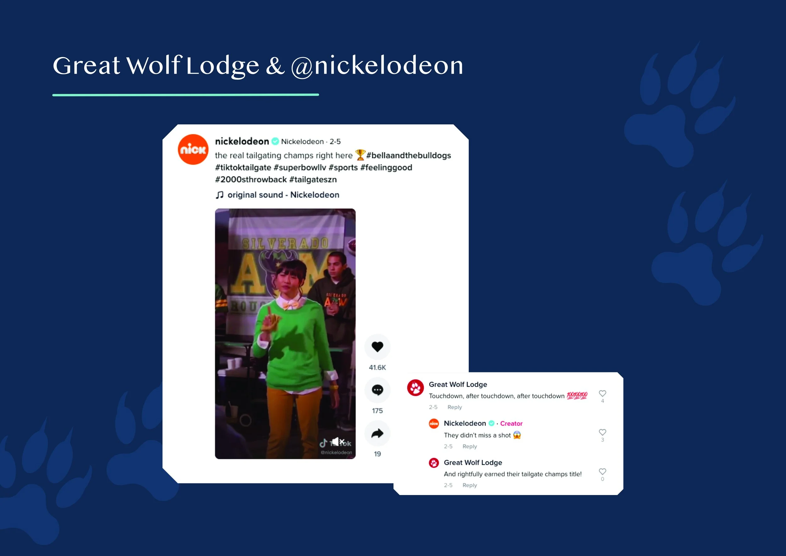 While at Likeable Media (now 10pearls) I helped lead a new service within the community management team focusing on proactive engagement for the Great Wolf Lodge account. I studied current trends and popular accounts that would share audiences with Great Wolf Lodge, and engaged in relevant trending conversations to push brand awareness and encourage community among guests online.
